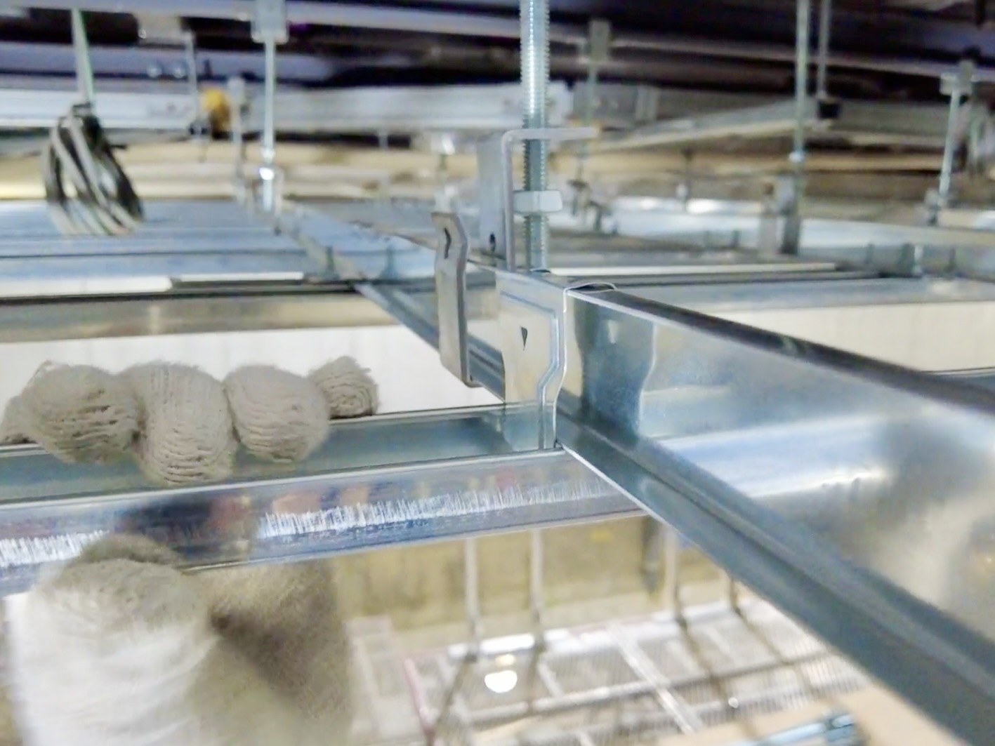 それらが交差するように天井に設置されているのですが、より頑丈な天井にしていくために、このバーをぐらぐらしないように固定する必要があります。